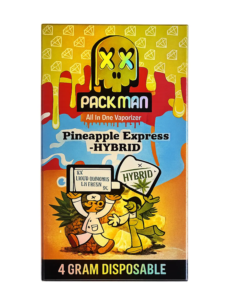 Experience smooth vapor and tropical flavor with the Pineapple Express Pack Man Liquid Diamonds D9 Live Resin Disposable 4G. This device combines liquid diamonds with live resin extract to create rich vapor and consistent performance. With a large 4-gram capacity, it delivers extended sessions in a simple disposable format.